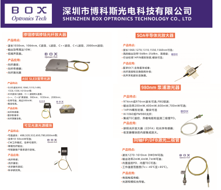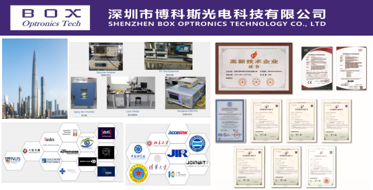 Shenzhen Box Optronics Technology Co., Ltd.(BOX Optronics Tech) zuntz optikoko komunikazioan eta zuntz optikoko sentsazioan espezializatutako goi-teknologiako enpresa bat da. Konpainiak bezeroei kalitate handiagoko produktuak eta zerbitzuak eskaintzeko konpromisoa hartu du, zerbitzuen erantzun denbora azkarragoak eta bezeroei balio handiagoa sortzen laguntzeko. I+G, produkzio eta salmenta gaitasun sendoekin, baita produktuen garapenerako ingeniari esperientziadunekin, konpainiak produktu pertsonalizatuak egokitu ditzake bezeroen behar ezberdinen arabera. Urte askotan, konpainiak berrikuntza teknologikoaren aldeko apustua egin du, etengabe teknologia aurreratuak eta talentua sartuz. AAA mailako kreditu-enpresa, teknologian oinarritutako ETE eta goi-teknologiako enpresa nazionalaren ziurtagiriak lortu ditu, eta ISO9001 kalitate-sistemaren ziurtagiria arrakastaz gainditu du, sistemaren eskakizunei zorrozki atxikiz eta produktuaren kalitatea zorrozki probatuz.