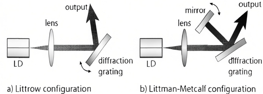 Barrunbe laburreko barrunbe nagusiko laserek, hala nola DFB eta DBR, barrunbe barruko fotoien interakzio-denbora mugatua dute, eta marra zabalera sakoneko konpresioa zaila da. Lerro-zabalera gehiago konprimitzeko eta zarata kentzeko, barrunbe laburreko barrunbe nagusiko konfigurazio horiek maiz kanpoko barrunbeko egiturekin konbinatzen dira errendimendua optimizatzeko. Kanpo-barrunbeen egitura arruntek kanpoko barrunbe espazialak, zuntz kanpoko barrunbeak eta uhin-gidariaren kanpoko barrunbeak dira. Zuntz optikoko gailuak eta uhin-gida-egiturak garatu aurretik, kanpoko barrunbeak osagai optiko diskretuekin konbinatutako optika espazialez osatuta zeuden nagusiki. Horien artean, sareetan oinarritutako espazio-kanpoko barrunbearen feedback egiturek batez ere Littrow eta Littman diseinuak hartzen dituzte, normalean laser-irabaziaren barrunbe batez, akoplatze-lentez eta difrakzio-sare batez osatuta. Sareak, feedback-elementu gisa, uhin-luzera sintonizatzea, modua aukeratzea eta lerro-zabalera konpresioa ahalbidetzen ditu.
